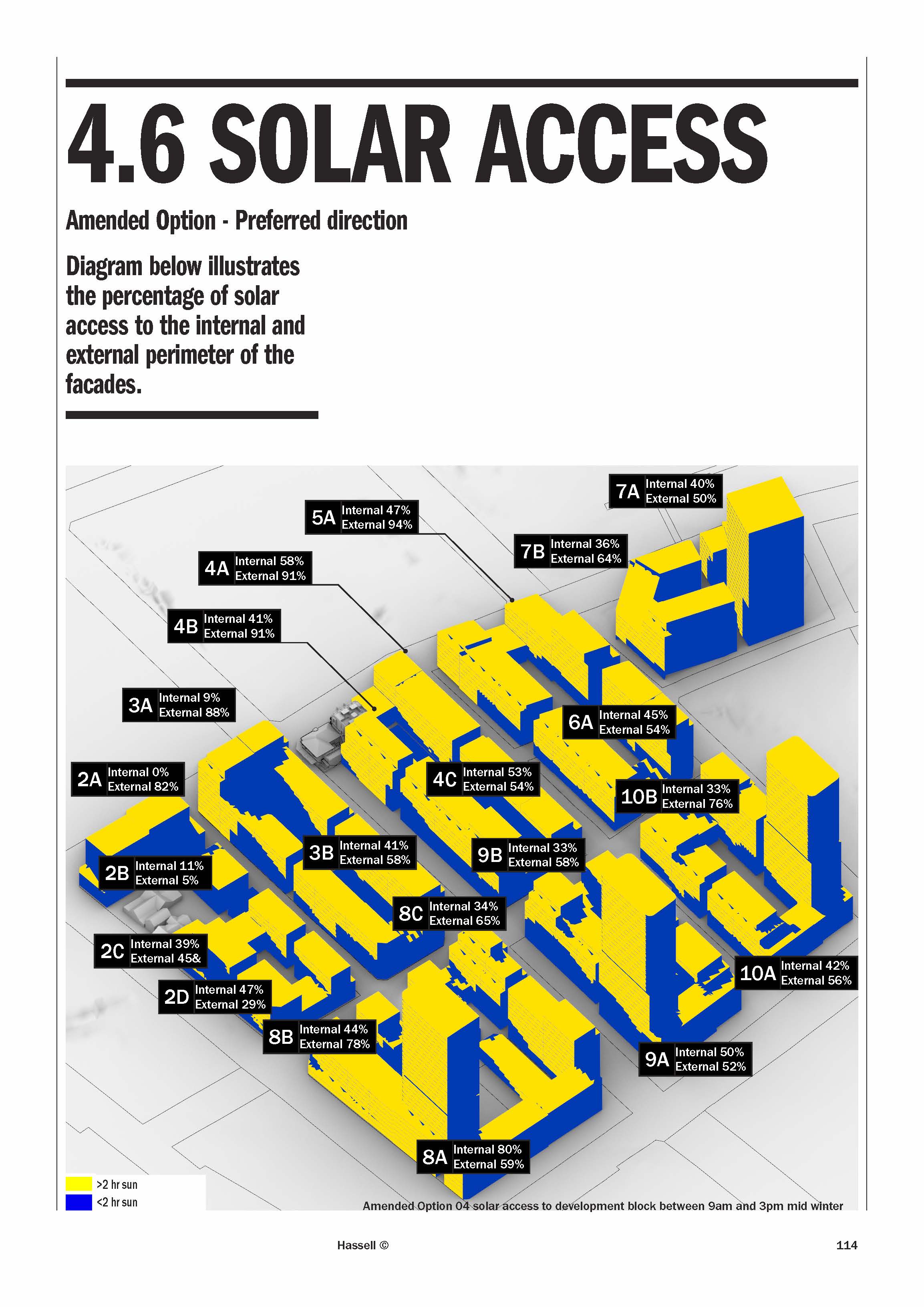 Solar Access for buildings in the Waterloo South Project ProposalThis diagram illustrates the percentage of solar access to the internal and external perimeter of the building facades for each development block in the Waterloo (South) planning proposal between 9am and 3pm mid winter. Yellow shows greater than 2 hours sun and blue shows less than 2 hours sun. It it from page 114 of the Addendum to the urban design report prepared by Hassel. Apart from section 4.7 (page 123-126) in the same report on the impact of the 4th tower there are no solar access diagrams in the planning proposal that relate to the planning proposal on exhibition. None of the maps in the urban design report for solar access to streets, open spaces, communal open space or deep soil zones that showing how many hours of sunlight different areas get for the preferred plan receives have been done for the exhibited proposal.https://dev.redwatch.org.au/RWA/Waterloo/South/wsexhibit/220307hassun/viewhttps://dev.redwatch.org.au/RWA/Waterloo/South/wsexhibit/220307hassun/@@images/image-1200-47c0adea69b66f21f192fcec2e57b6d4.jpeg