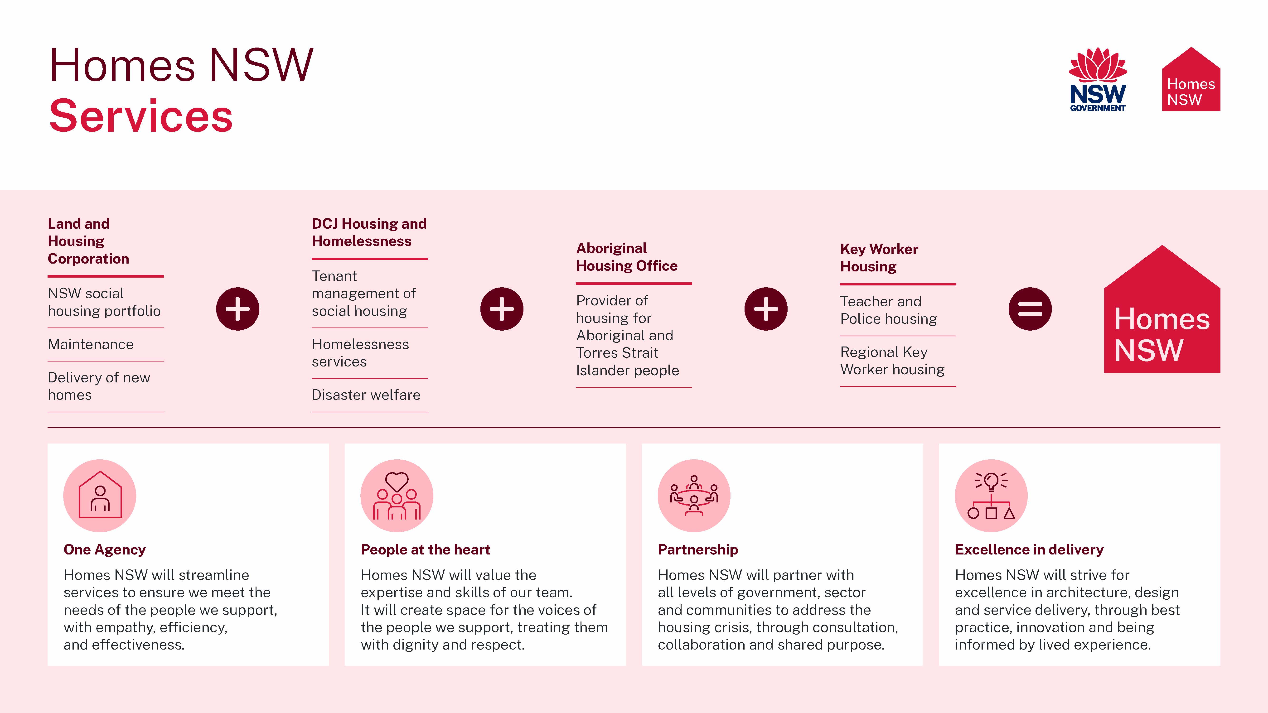 Homes NSW ServicesThis Homes NSW Services diagram shows what makes up Homes NSW and how it proposes to deliver services.https://dev.redwatch.org.au/RWA/Waterloo/lahc22-23/HomesNSW_ExplainerSlides_Services.jpg/viewhttps://dev.redwatch.org.au/RWA/Waterloo/lahc22-23/HomesNSW_ExplainerSlides_Services.jpg/@@images/image-1200-df770956830a900ba2b3c0a54ee42678.jpeg