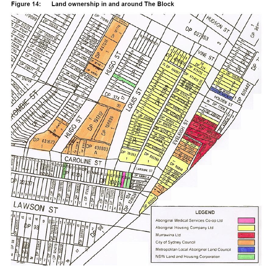 This map shows land ownership around The Block in Redfern in early 2004. This map is Figure 14 "Land ownership in and around The Block" from the NSW Government Submission for the Inquiry into Redfern and Waterloo 30 April 2004. File size is 229 Kb.