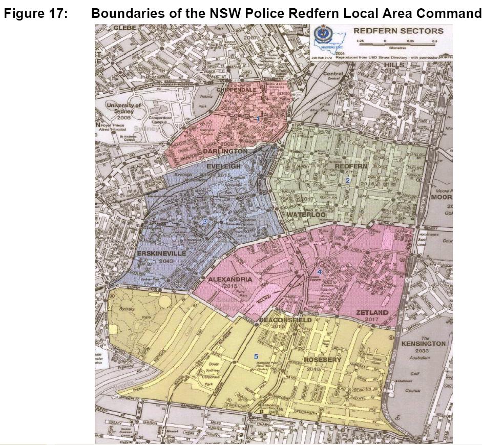 This map shows the area covered by the Redfern LAC. This map is Figure 17 "Boundaries of the NSW Police Redfern Local Area Command" from the NSW Government Submission for the Inquiry into Redfern and Waterloo 30 April 2004. File size is 200 Kb.