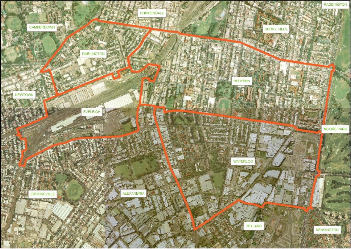 This map shows a photo of the suburbs that make up the RWA with the suburb boundaries marked. This map is Figure 1 "Area covered in surrounding linked communities" from the NSW Government Submission for the Inquiry into Redfern and Waterloo 30 April 2004. File size is 264 Kb.