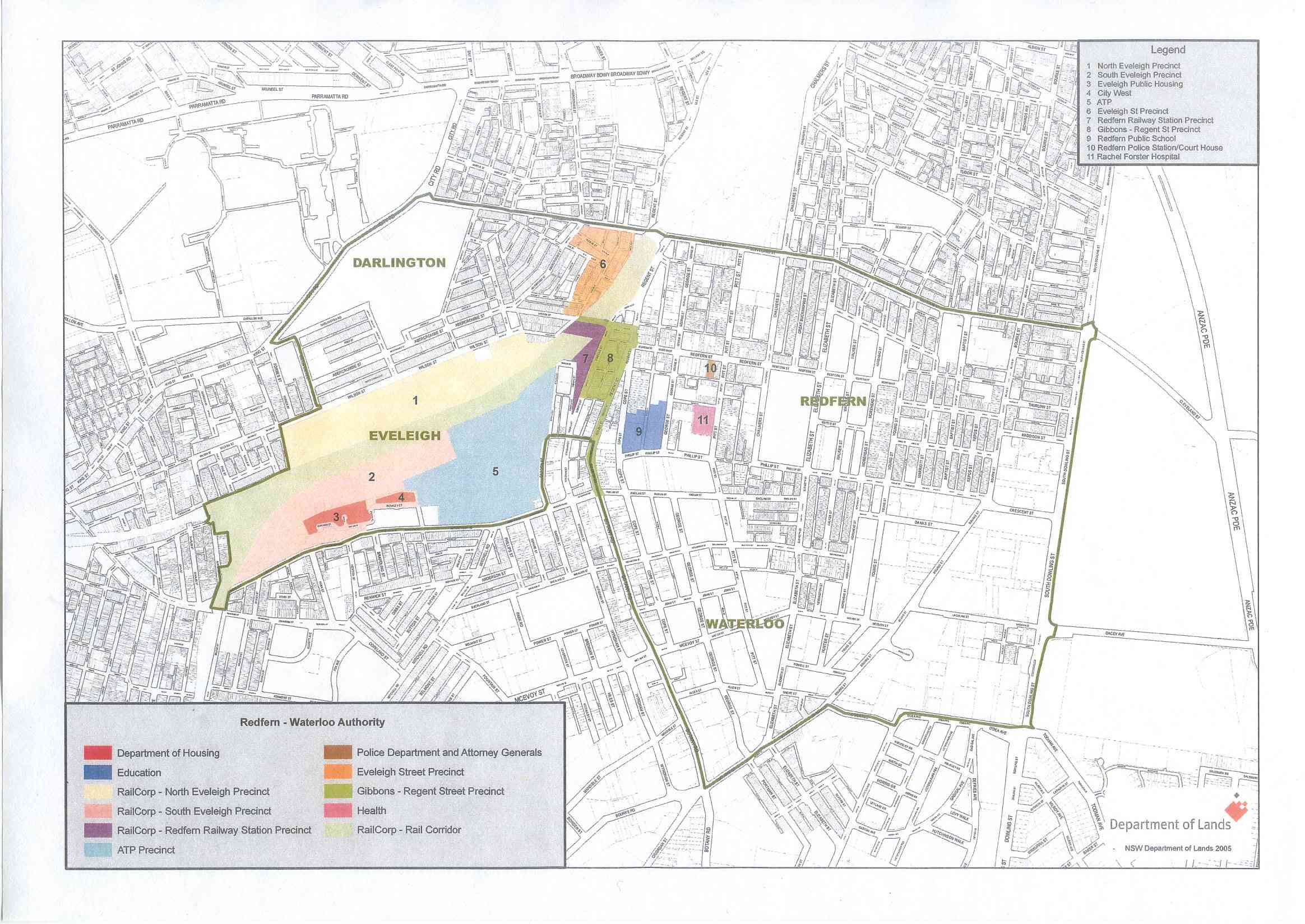 This map shows the areas that the RWA is using to refer to the various parts of Redfern Waterloo that were declared state significant and under their control. This map was first shown to the community at the Minister's meeting with public tenants. The RWA website contains a 5 MB version of this map - This File is 336 Kb.