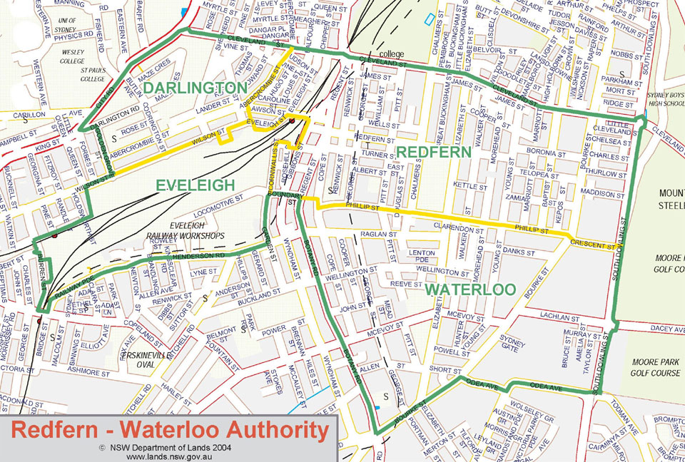 This map is the official RWA boundary map. It can be found on the RWA site at http://www.redfernwaterloo.com.au/images/map.jpg . The file is 270Mb.