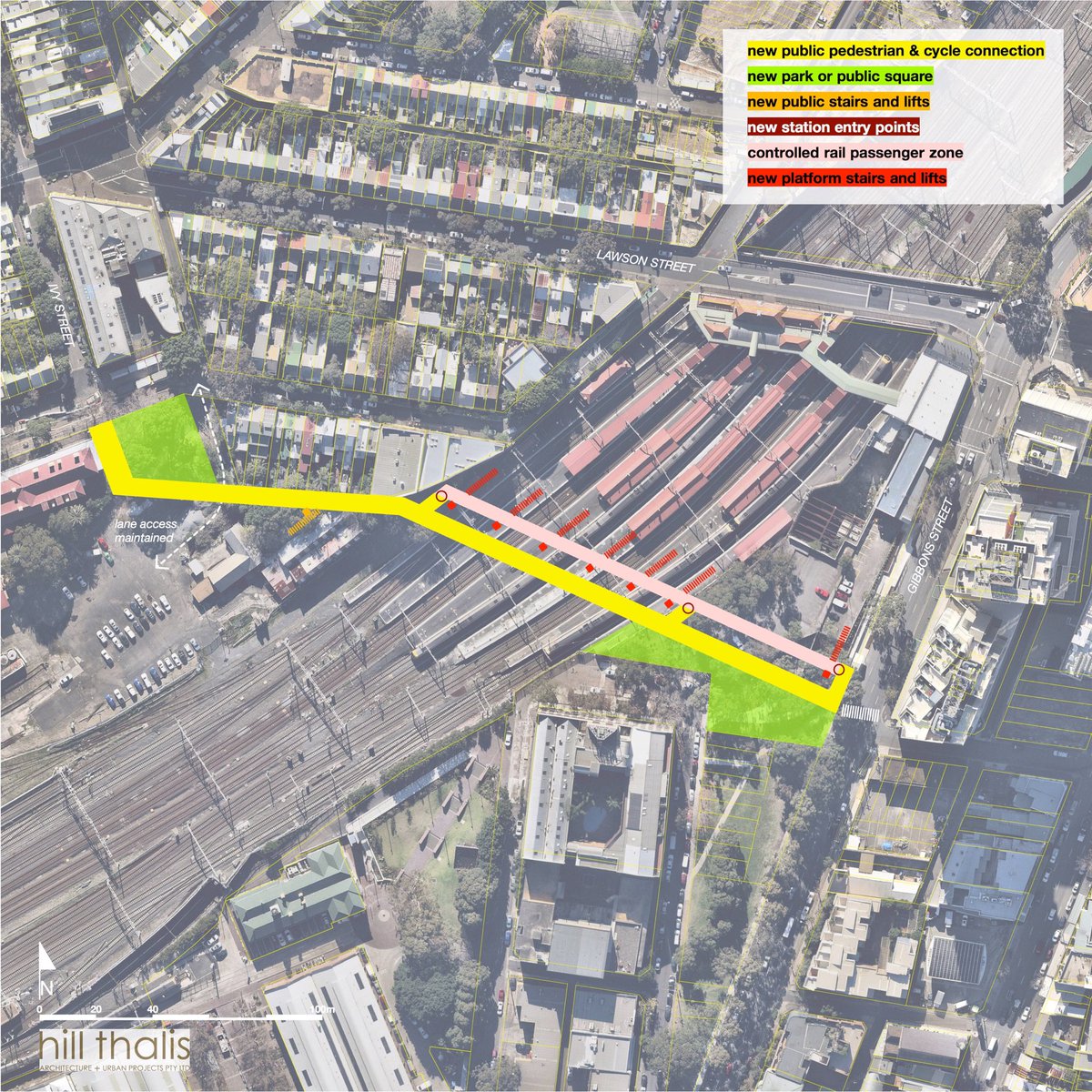 This suggestion tweeted by Philip Thalis on 5 July 2019 shows how a parallel public and paid concourse could join North Eveleigh and Gibbons Street. Many stations have parallel paid and unpaid concourse so this could be done as part of a single bridge. This proposal allows a paid concourse to platforms 11 & 12 and an unpaid concourse to buses. This proposal does not link to South Eveleigh which is seen as a major requirement both for those exiting the station and for cross rail corridor movements.