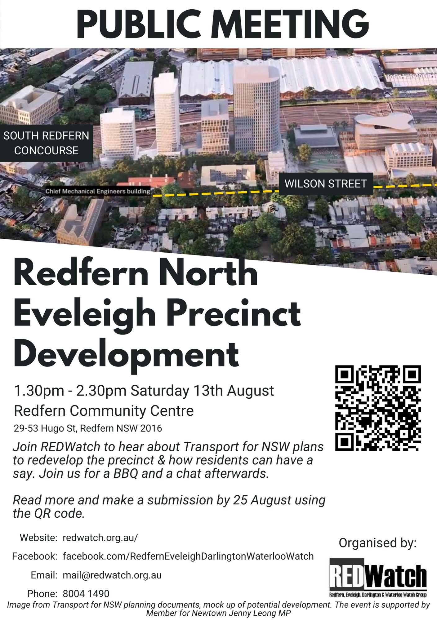 Poster for North Eveleigh Public Meeting 13 Aug 1.30pm