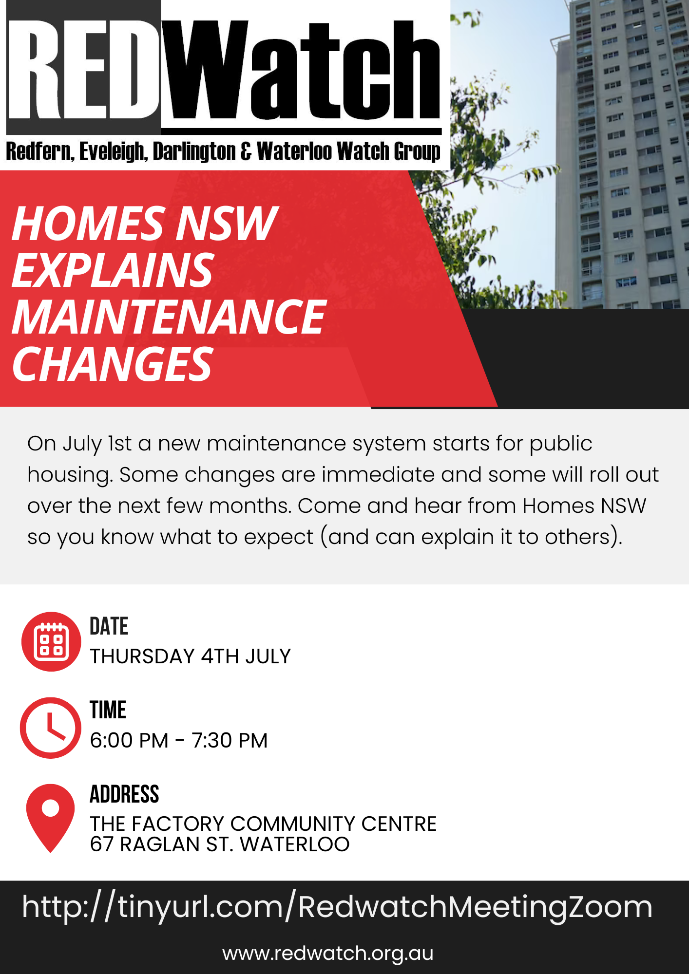 On July 1 a new maintenance system starts for public housing. Some changes are immediate some will roll out over the next few months. Homes NSW will attend the REDWatch meeting on 4th July to explain the changes. Come and hear Homes NSW so you know what to expect and can explain it to others. Please spread the word using this flyer to public housing tenants. The July REDWatch meeting will be held at 6pm on Thursday 4th July 2024 at Counterpoint’s Factory Community Centre, 67 Raglan St Waterloo and it will also be available on Zoom via http://tinyurl.com/RedwatchMeetingZoom .