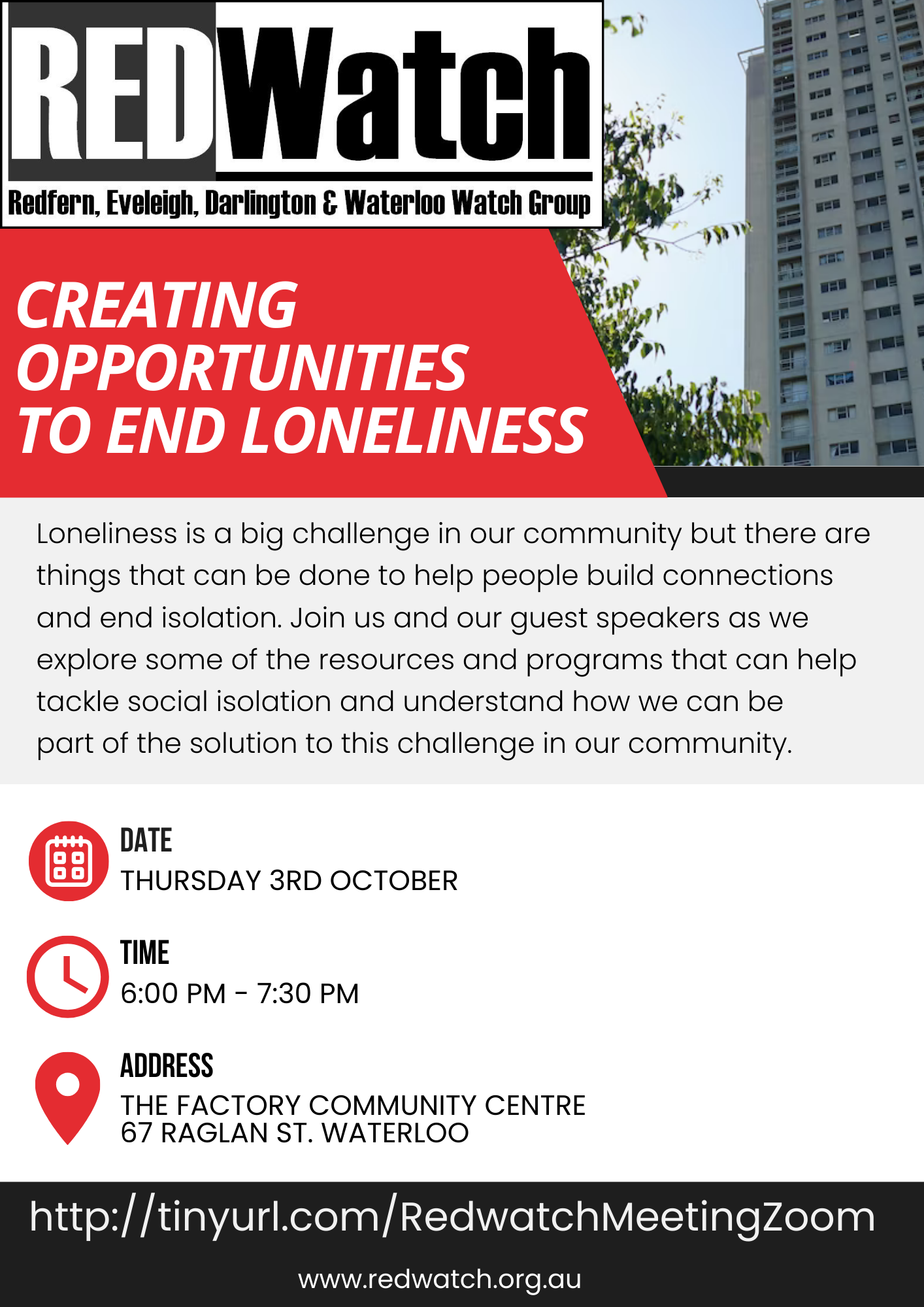 Loneliness is a big challenge in our community but there are things that can be done to help people build connections and end isolation. Join us and our guest speakers as we explore some of the resources and programs that can help tackle social isolation and understand how we can be part of the solution to this challenge in our community. This is the flyer for the REDWatch meeting on Loneliness on 3 October 2024.
